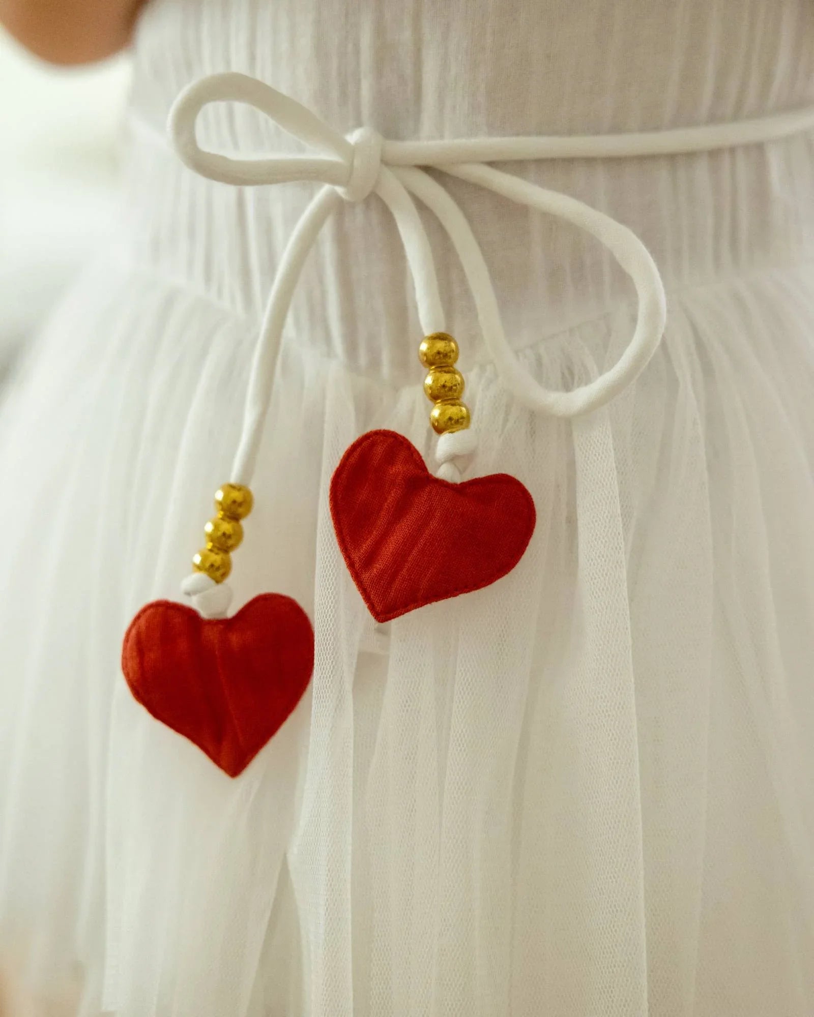 The Freya Tutu in White is THE elegant piece for this summer. Perfect for your little one to twirl through special occasions. Crafted from soft cotton gauze with a delicate layered tulle skirt, it blends comfort and charm effortlessly. The playful cherry embellishment and heart-shaped accessories add a touch of fun to its classic design.