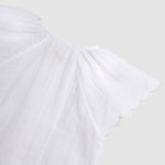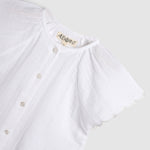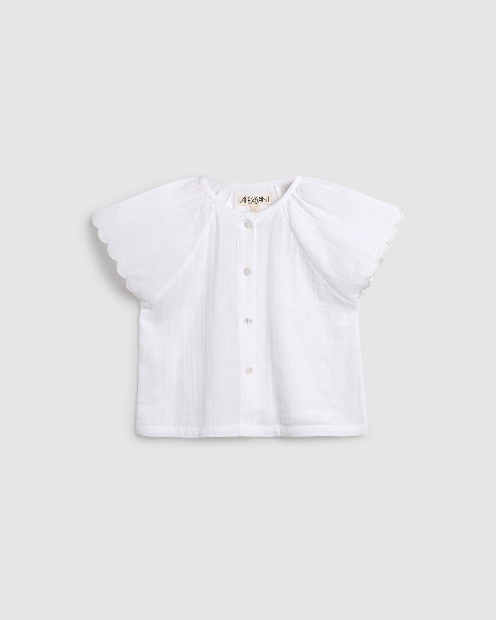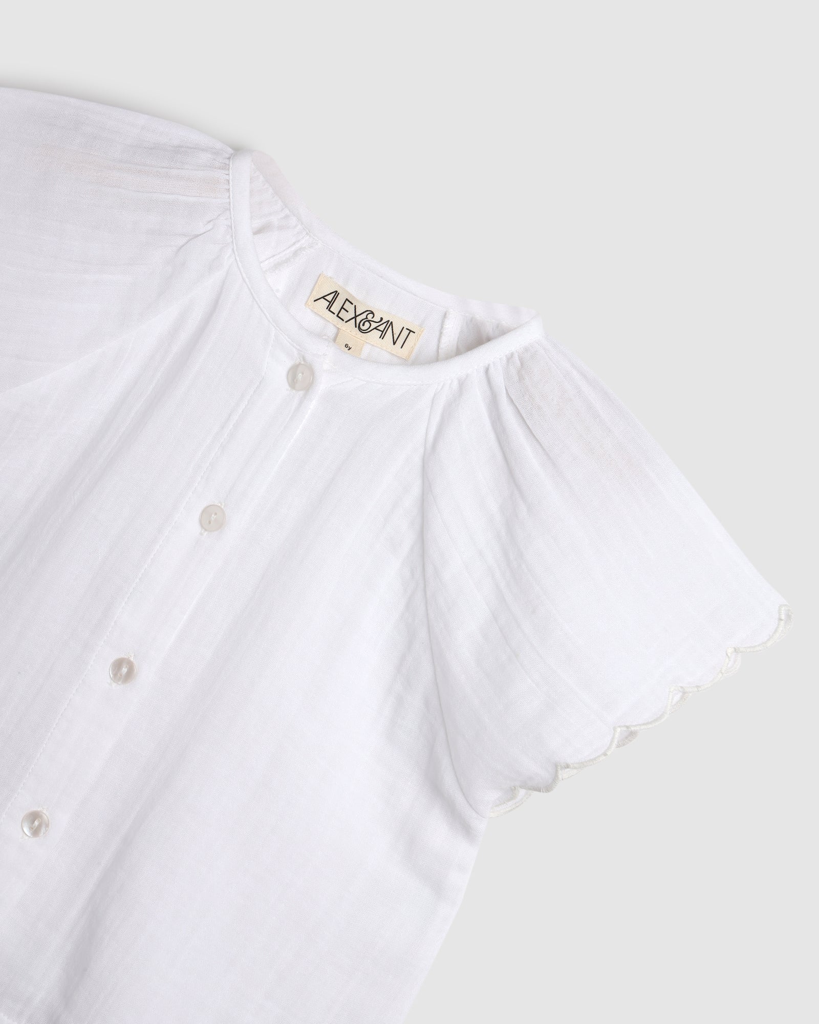 The Emmi Top in white cotton gauze is a versatile and stylish addition to your little one's wardrobe. Featuring delicate scalloped sleeves, this top is perfect for pairing with skirts, shorts, or jeans. Made from soft cotton gauzeit provides comfort and breathability for all-day wear.