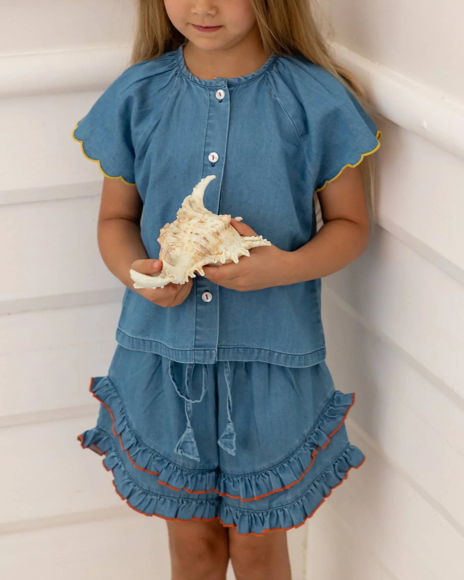 The Tessa Shorts in Chambray are a stylish and comfortable option for warm-weather days. Featuring playful ruffle trims with vibrant contrast stitching and a soft elastic waistband with a tassel drawstring, these shorts are both functional and fashionable. Perfect for pairing with any top, they bring a touch of charm to everyday outfits.