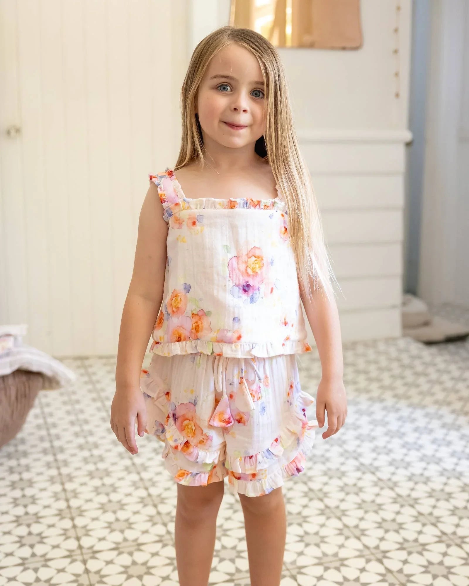 The Stella Shorts in Roses are a perfect combination of comfort and charm, designed for warm-weather adventures. Featuring a colourful floral print and delicate ruffle detailing along the edges, these shorts are as playful as they are stylish. The elasticated waistband and adjustable tie ensure a secure and comfortable fit, making them ideal for active little ones.