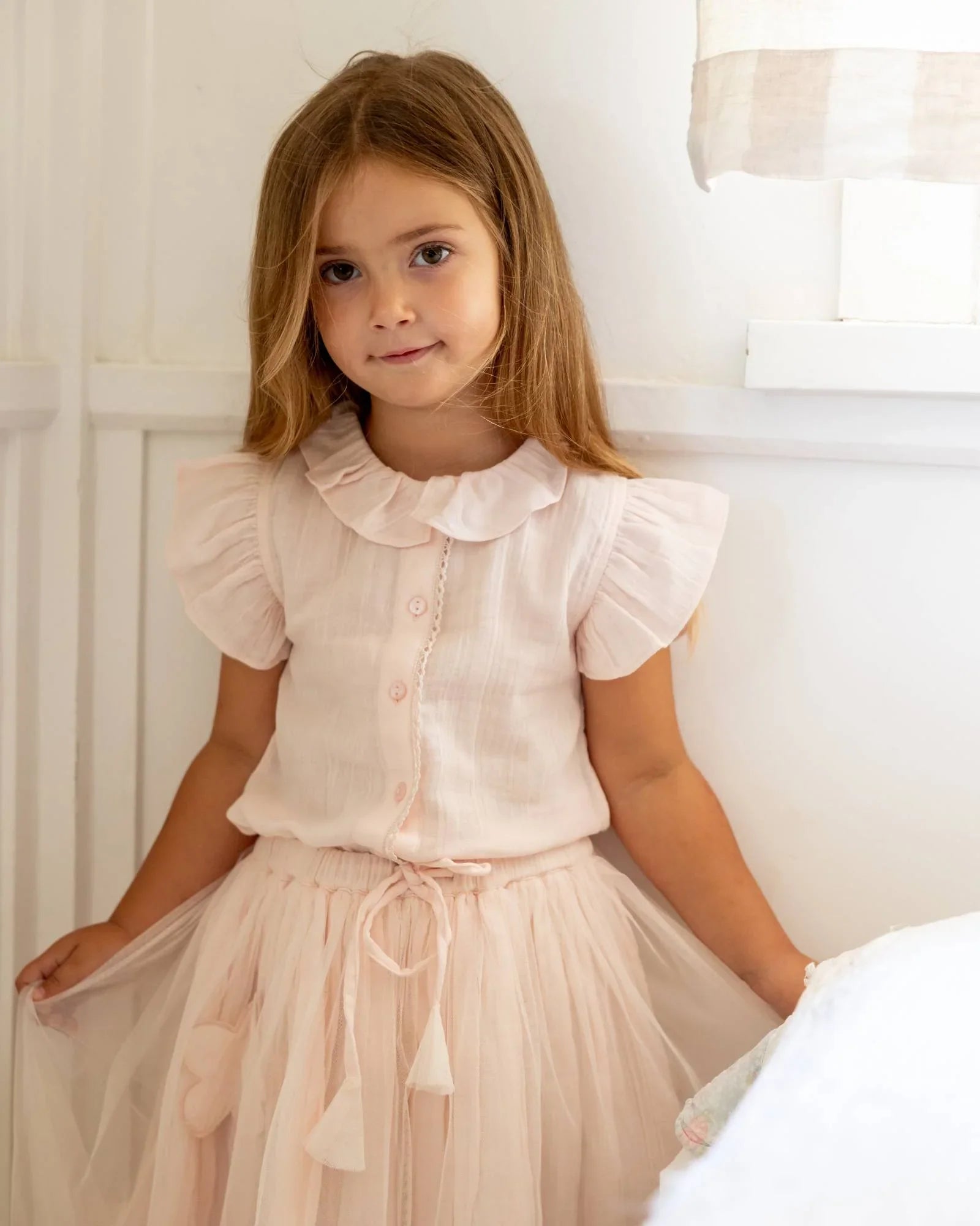 The Willie Top in Petal Pink is a sweet and timeless wardrobe essential for your little one. Featuring ruffled cap sleeves and a delicate collar, this button-down top adds a touch of elegance to everyday wear.