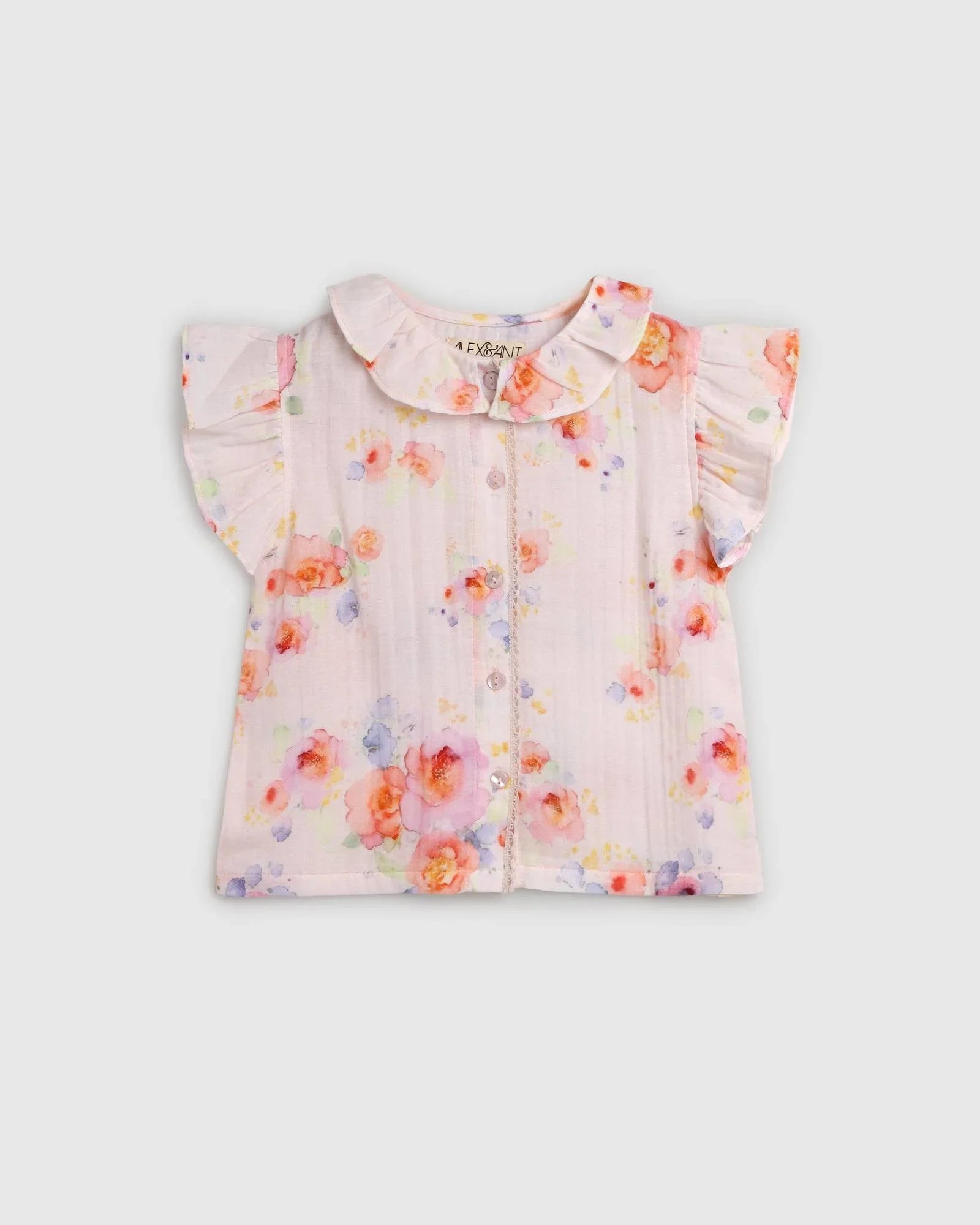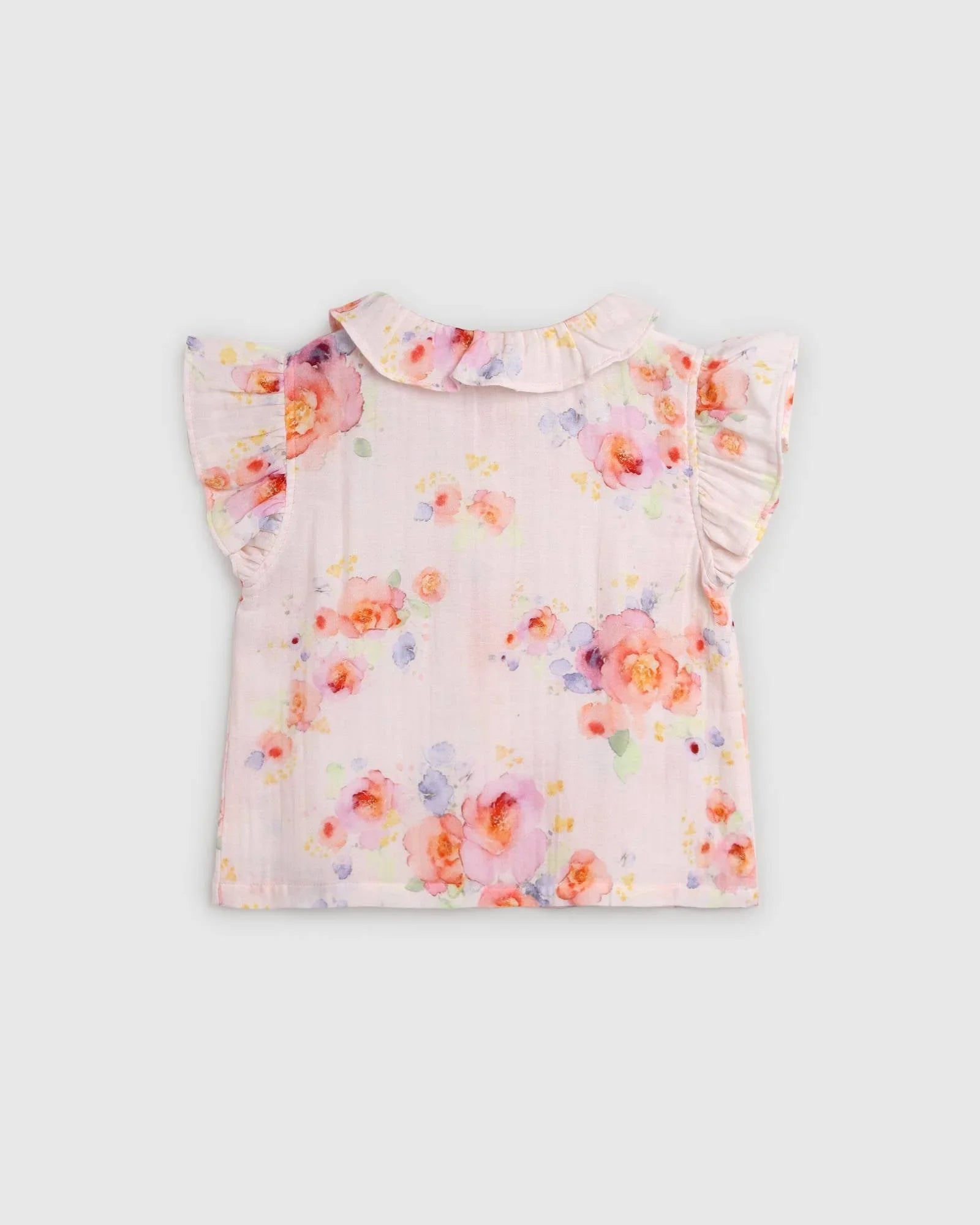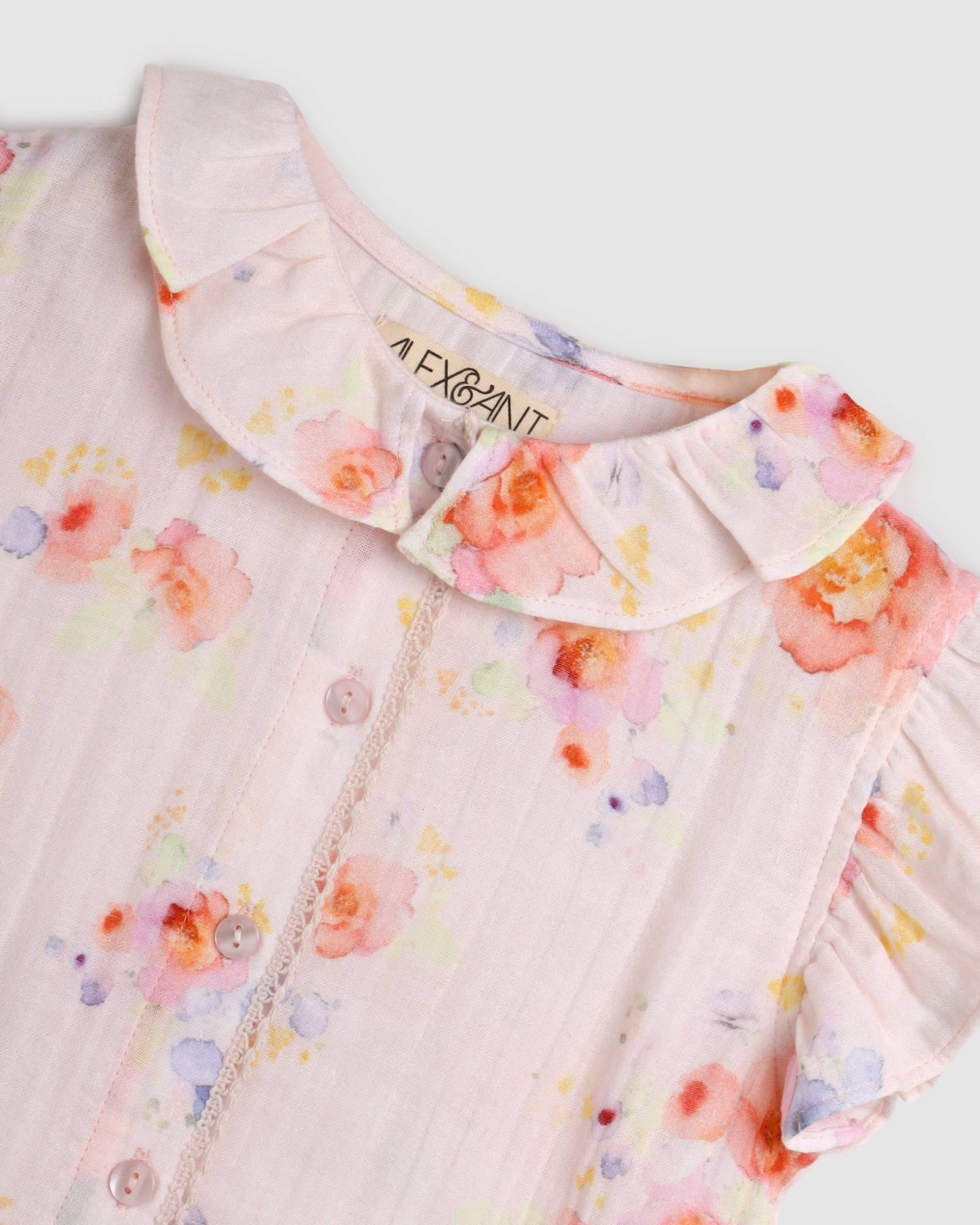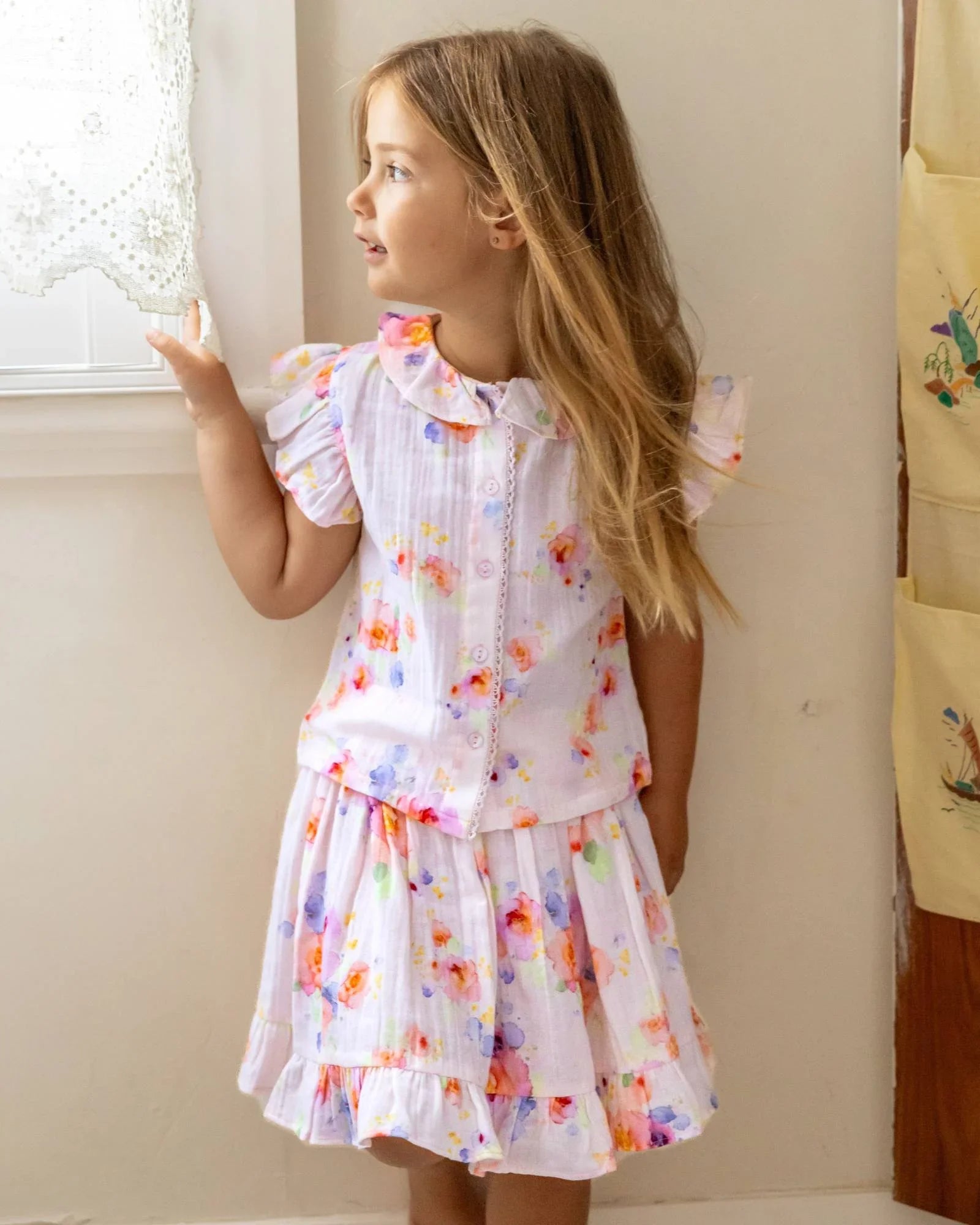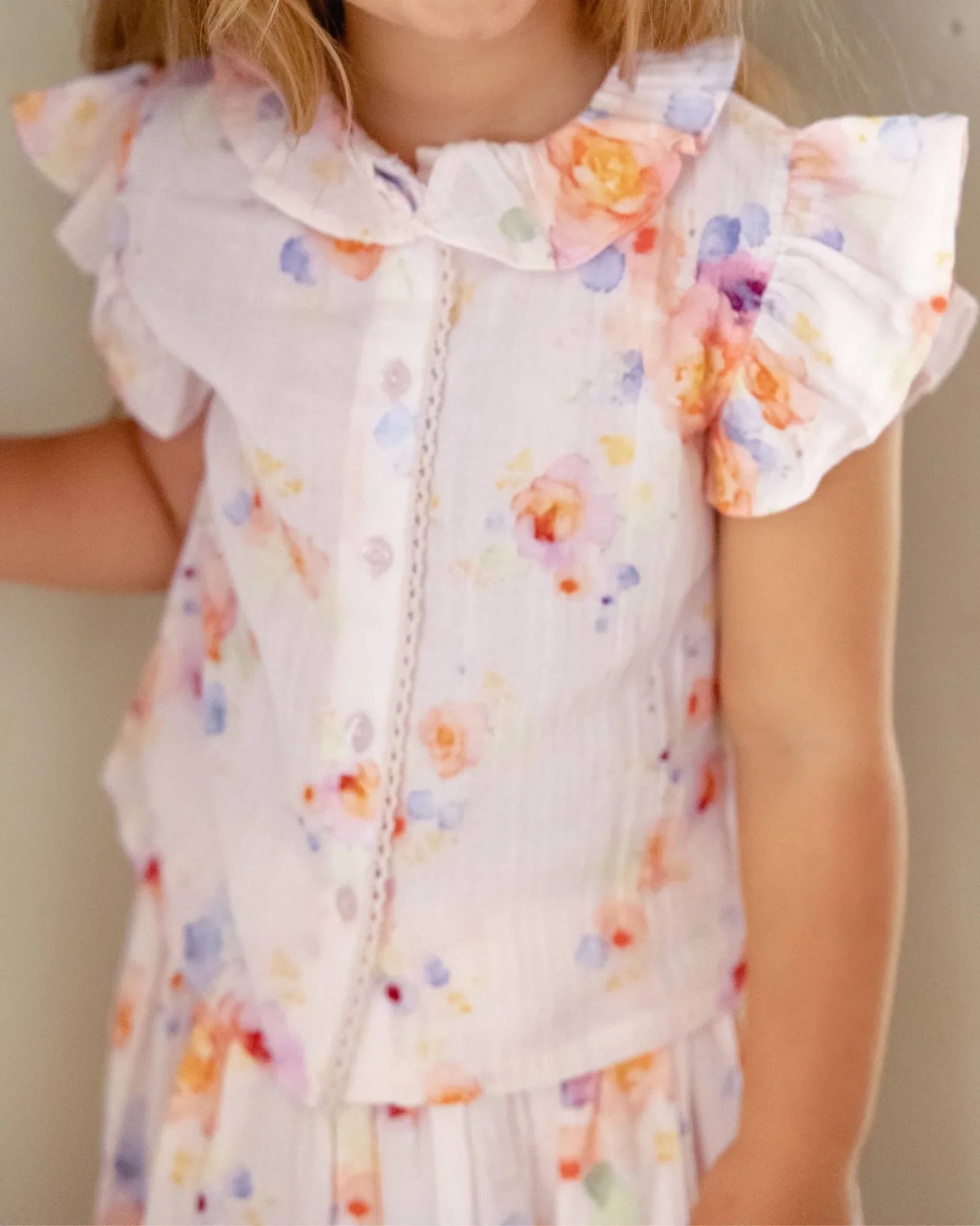 The Willie Top in Roses is a sweet and timeless wardrobe essential for your little one. Featuring ruffled cap sleeves and a delicate collar, this button-down top adds a touch of elegance to everyday wear.